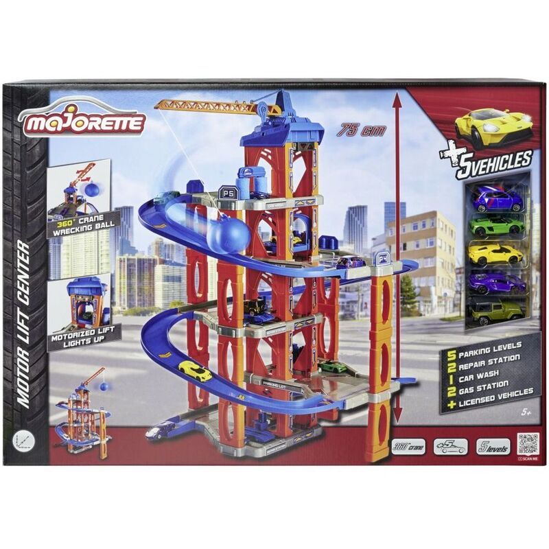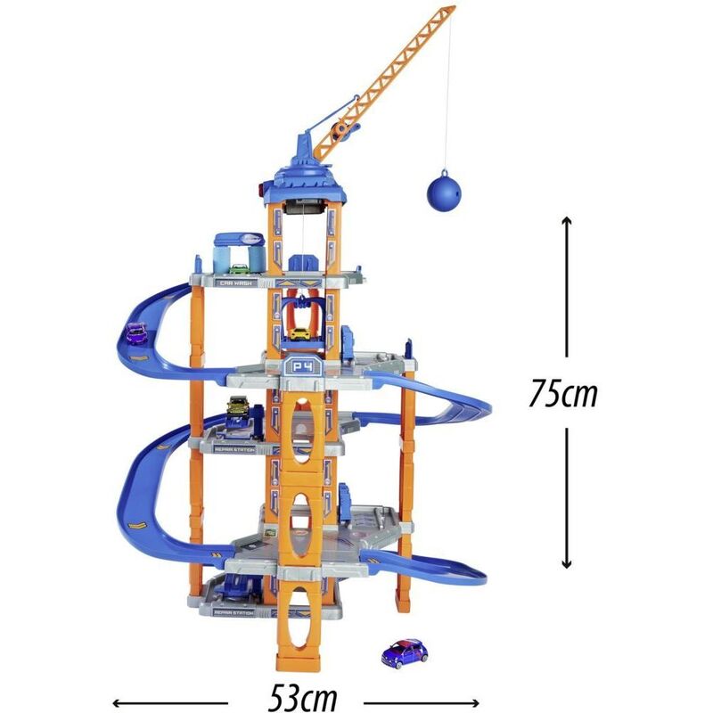 The large parking garage offers exciting adventures for small cars and their drivers on 5 floors. You won't get bored here! The 53 x 56 x 73 cm car dealership offers a motorized lift (batteries not included), a gas station, a 360 degree crane with a wrecking ball, a car wash, a lifting platform and a rapid descent. A 7.5 cm long Lamborghini Aventador, Audi R8 Spyder, Jeep Wrangler, Ford GT and a Renault Twingo with freewheel, suspension and metal body are included.