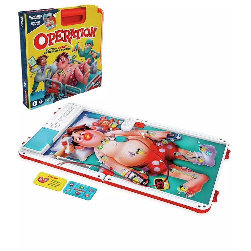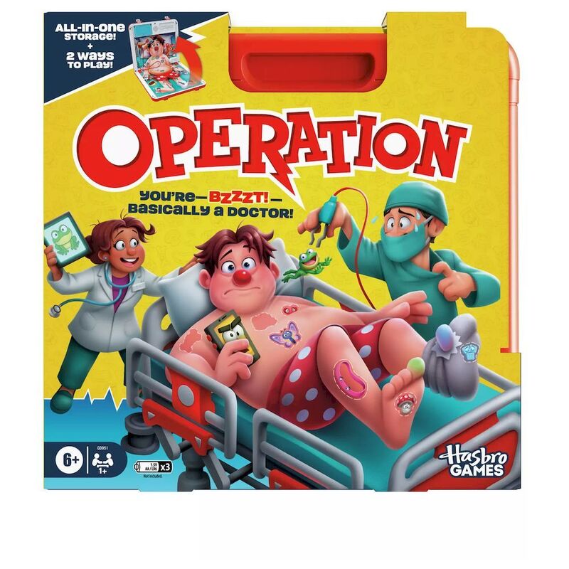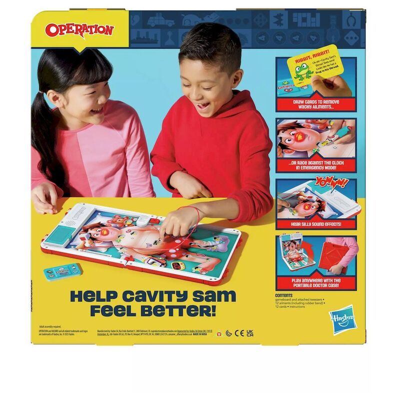 You're - BZZZT! - basically a doctor. It's the favorite kids board game with exciting updates! In this edition of the Operation game, choose from 2 ways to play: classic gameplay in Hospital mode or an edge-of-your-seat frenzy in Emergency mode. In Hospital mode, little doctors draw Bandage cards for wacky ailments. The suspense builds as they try to keep their hands steady while operating on Cavity Sam or - BZZZT! - his red nose lights up.