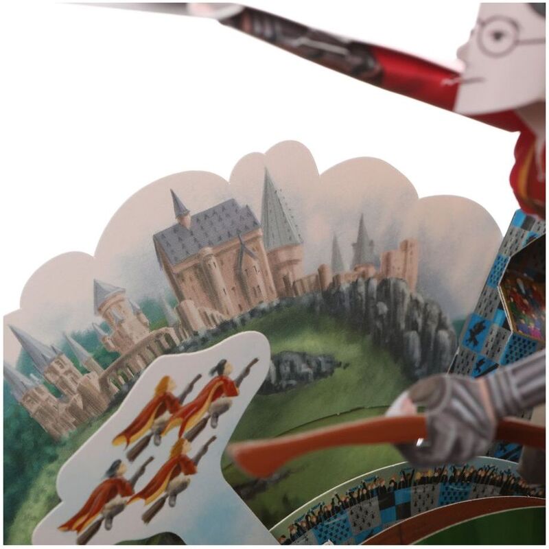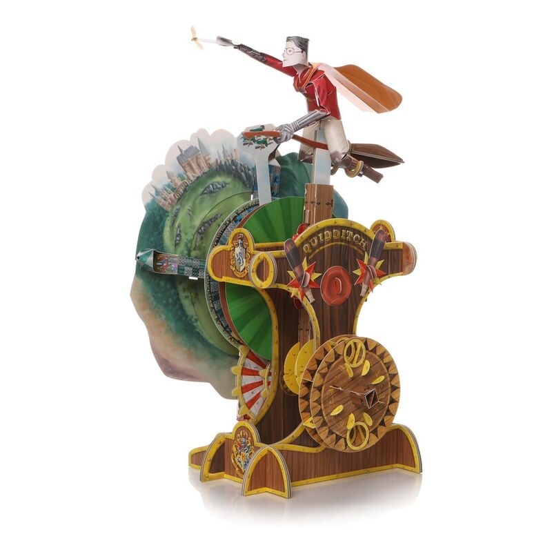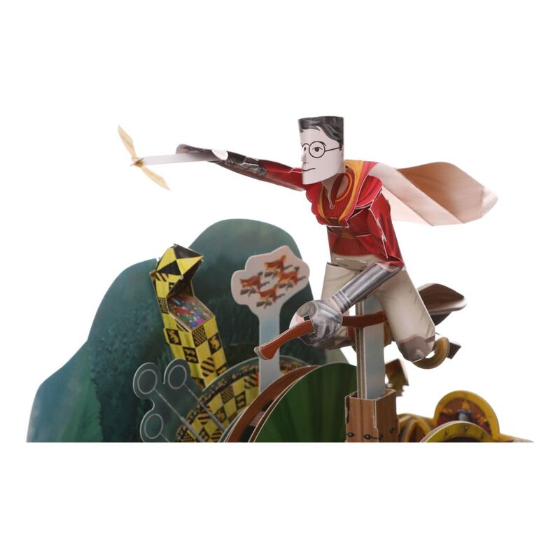 This mechanical card model of Harry Potter playing Quidditch is a must-have for every Wizarding World fan! This is a feat of cardboard engineering, utilising an impressive array of mechanical principles, including a crankshaft, gears with different ratios, and a central crank slider. And it is all assembled with no glue, cutting or other materials required! Inside youll find several sheets of press-out card pieces, each expertly illustrated and designed to build this spell-binding structure. When the model is complete, turn the front wheel to activate the cog machinery and see every part move independently.