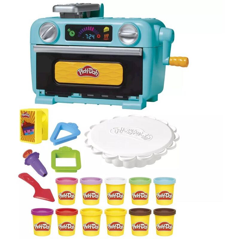 Make any day a colorful celebration with the Play-Doh Super Slice Cake Playset! It's a great kitchen set for kids to create Play-Doh cakes by the slice for lots of creative possibilities. To start, shape some make believe cake mix balls and place them in the toy oven. Press the handle and open the door to hear a fun bell sound and see a slice come spinning out! Stack multiple colors for imaginary layer cakes or - if you dare mix the colors - create a marbled effect. The built-in frosting roller and cutters make it easy and fun to add smooth pretend frosting right onto the slices. Add colorful Play-Doh frosting dollops and pretend play food candies with the decorating tool and molds. Cooking toys like this kids playset can bring lots of tactile play for party gifts and fun creative activities for kids 3 years and up.