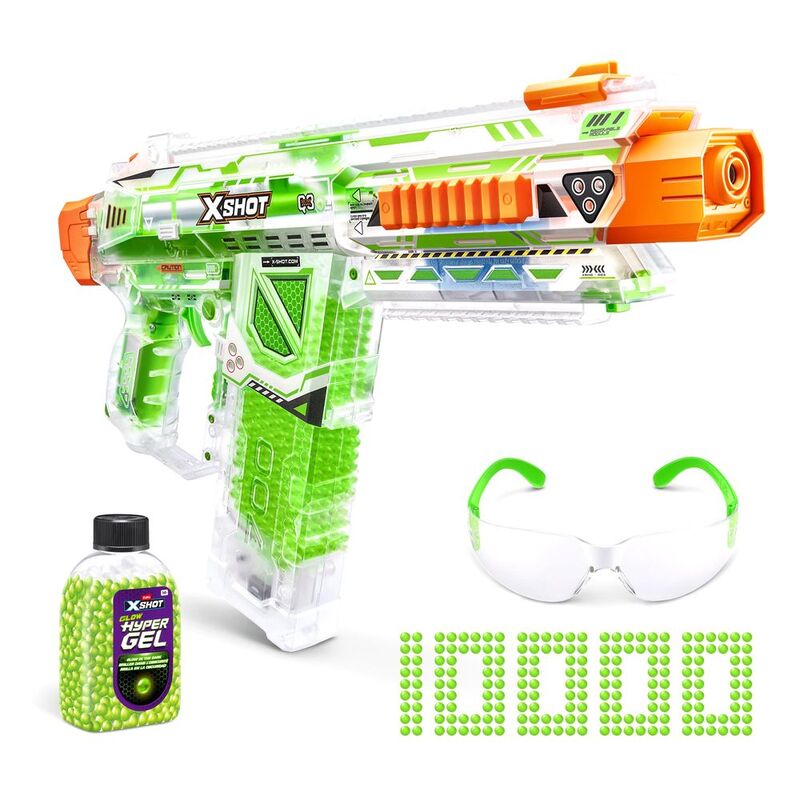 It's time to get hyped up with XSHOT Hyper Gel! The XSHOT Hyper Gel Glow In The Dark Nightmare is the largest blaster in the Glow in the Dark Hyper Gel range and can blast Hyper Gel Pellets at 200 feet per second with its motorized fully and semi automatic modes. Battle all night long with the Nightmare's Glow in the Dark technology, and Glow in the Dark Gel Pellets, which will push your blaster battles to the NEXT LEVEL! XSHOT Hyper Gel Glow In The Dark Nightmare has a 700 Pellet capacity mag. This motorized Gel Blaster comes with a rechargeable battery. Stocked with 10,000 Glow in the Dark Hyper Gel Pellets and protective eyewear, just add water to start the ultimate Gel Blaster battle!