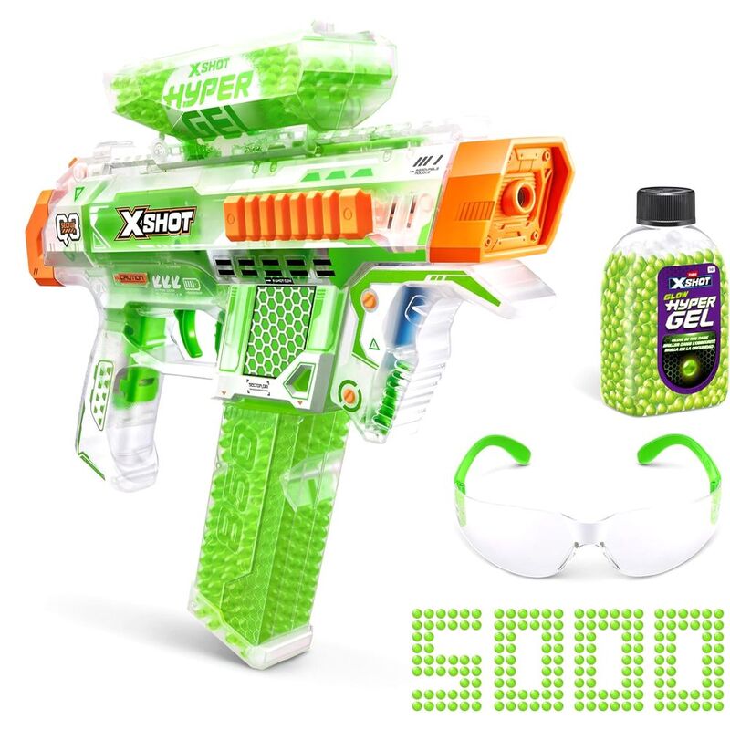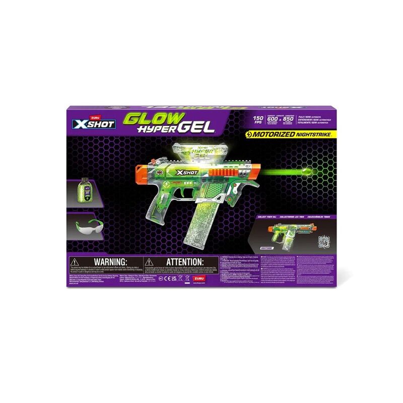 It's time to get hyped up with XSHOT Hyper Gel Glow in the Dark! XSHOT Hyper Gel Glow In The Dark NightStrike can blast Hyper Gel Pellets at 170 feet per second with its motorized fully and semi automatic modes. Battle all night long with the NightStike's Glow in the Dark technology, and Glow in the Dark Gel Pellets, which will push your blaster battles to the NEXT LEVEL! The NightStrike has a 600 Pellet capacity hopper, when you run out of Gel Pellets simply flip your blaster to reload from the 850 Pellet capacity mag. This motorized Gel Blaster comes with a rechargeable battery. Stocked with 5,000 Glow in the Dark Hyper Gel Pellets and protective eyewear, just add water to start the ultimate Gel Blaster battle!