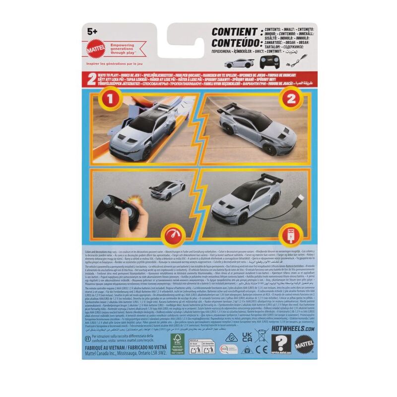 Speed into racing and stunting with the Hot Wheels RC Ford Mustang GTD in 1:64 scale. This full-function remote-control Hot Wheels RC toy car packs authentic details and cutting-edge design including spoiler and hood vents as well as a metallic-paint finish. Drive it on the iconic Hot Wheels orange track (sold separately) or go off-track for open-ended play and exploration. Hit the booster button on the remote to zoom into loops and perform stunts. Colors and decorations may vary.