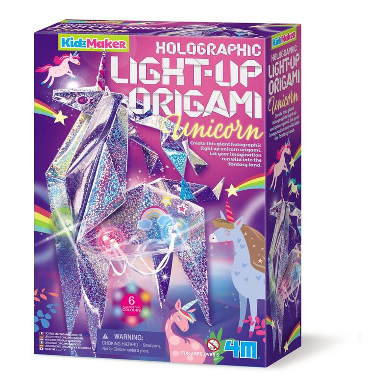 - Contents: 2 holographic origami papers, supportive card set, string lights with 5 light bulbs, light bulb holder platform, eyes and graphic stickers, pegs and rings, adhesive tab and detailed instructions