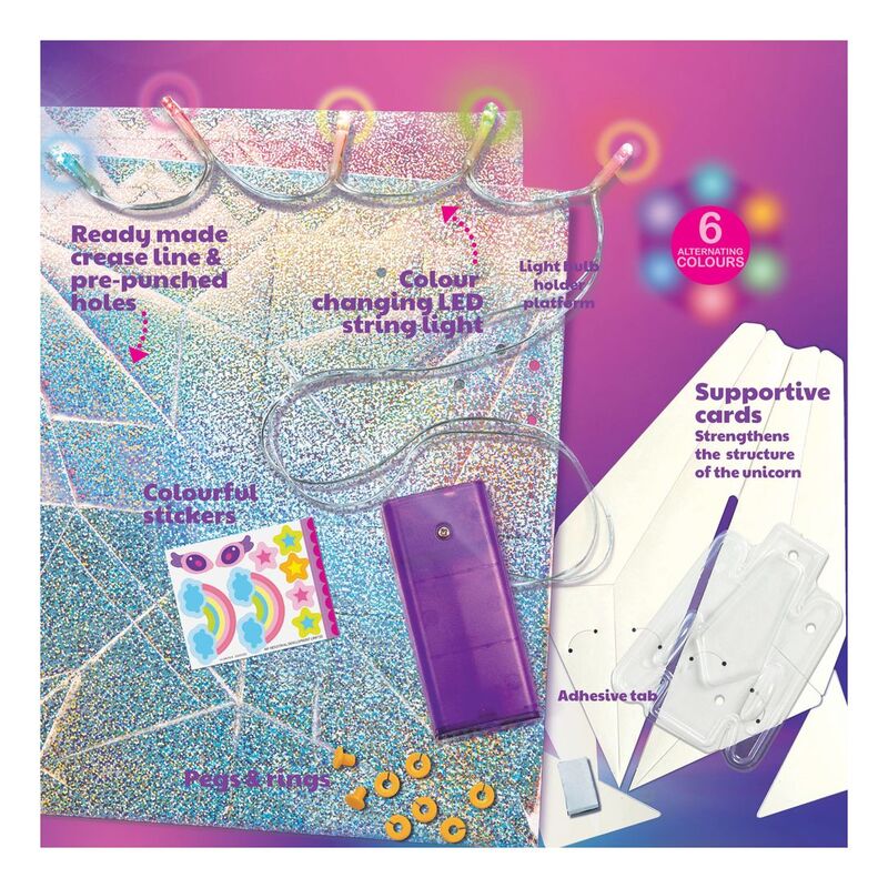 Create a large, stunning unicorn from special holographic paper that has ready made crease lines and pre-punched holes. Add the supportive cards to strengthen the structure and decorate with stickers, then insert the little set of battery-operated LED lights to make the holographic paper truly sparkle!